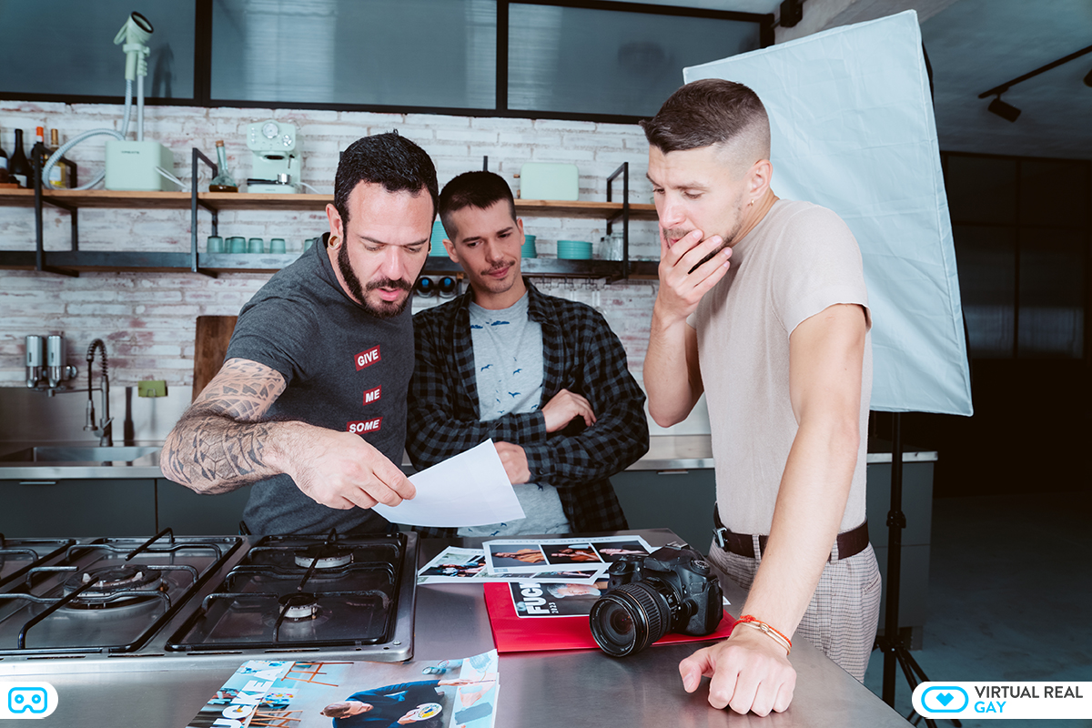 A fashion shoot for a glossy gay lifestyle magazine, turns into a wild butt fucking threesome in VR!