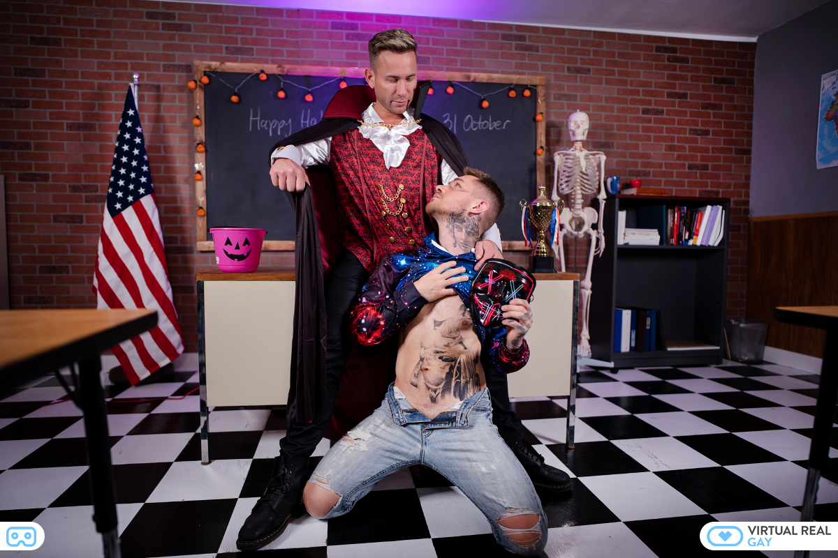 A creepy Halloween party game starts to go too far, and you and Zak Bishop flee to the escape room, where you both sit naked and trembling. The sight of each other’s naked bodies however starts to cause arousal, and both your dicks start to throb, as you forget your fears, and begin to be overcome with lust. The ghosts of the night no longer hold any terrors for you, as you proceed to take turns slamming one another’s butts with your huge boners!