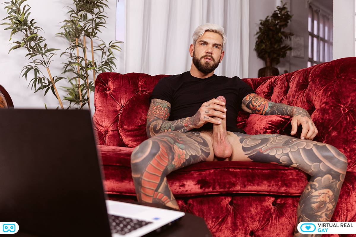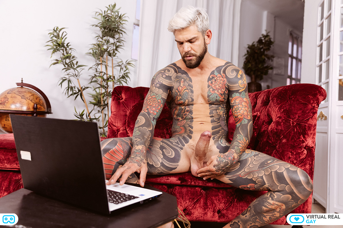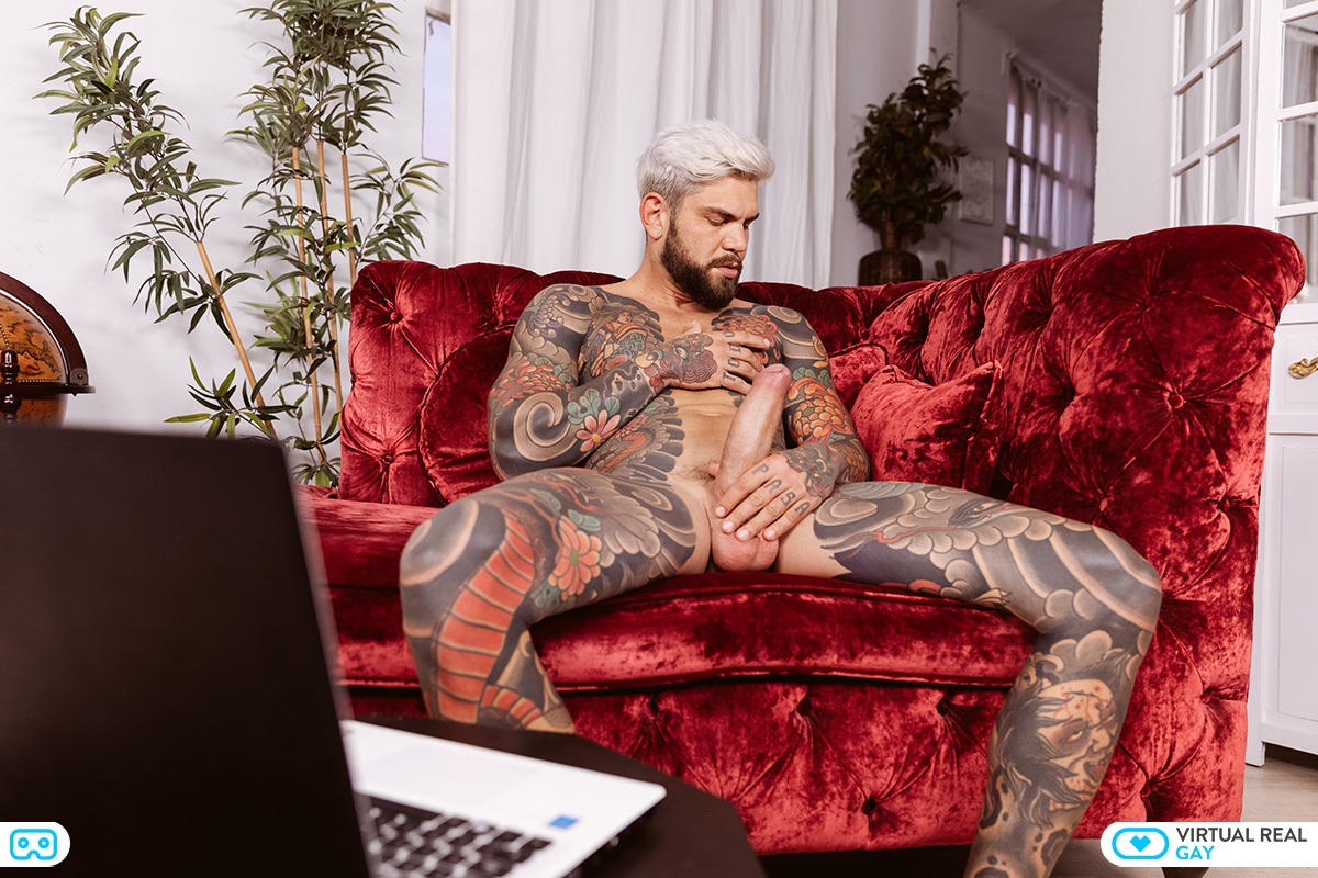 Juan Lucho thought his private live VR masturbation show was only going to be seen by his boyfriend. But now you can experience it in virtual reality, and enjoy Juan’s big dick almost touching your face, as he strokes it until he ejaculates! And this hot tattooed gay stud will do more than that. He will jerk off in multiple positions, letting you get a perfect view of his toned body from every angle. He’ll play with his balls, and finger his tight ass for you. You will both be stroking your hard cocks like madmen towards the end of this ‘private’ VR show, as you both finally edge towards mutual sperm filled ejaculations!