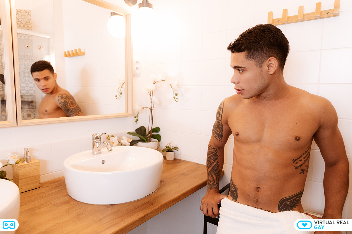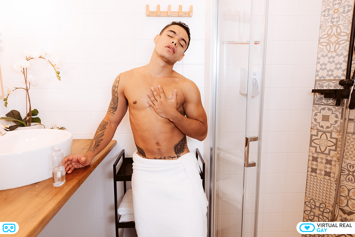 Beautiful mixed race twink Randy Junior jerks his young cock off for you, in a deeply personal and erotic private gay VR cam show. The horny lad starts off in the bathroom, wearing only a white towel, and admiring his own good looks in the mirror. He knows he is good looking, and sometimes wishes he could fuck himself. But he can do the next best thing – he can stroke his ethnic cock until his creamy white sperm is exploding out of it. He looks straight into the VR camera, knowing you are there with him in virtual reality, getting off yourself on his tight young body, and his handsome mixed race looks. He shows you his supple butt and teases you, realizing that you can see it could take a hard fucking from an older man. Then he sits down and begins to stroke his dick, trying to imagine that you are sucking it hard!