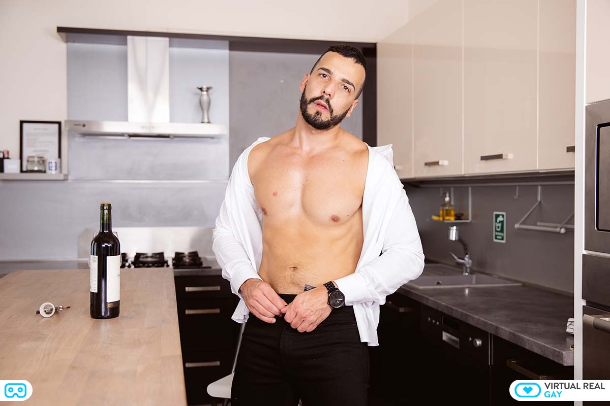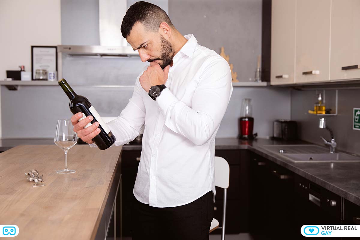 Bearded Latino stud Francisco Ranniero is feeling horny after a long day’s work. With nobody to fuck at home, he decides to take matters into his own hands, in more than one way. He is desperate for the taste of sperm in his mouth, and he’s going to fap his cock like a madman until he ejaculates into the palms of his hand. To relax himself, as well as lower his inhibations for the task at hand, he first pours some wine into a glass, and takes a few sips. Then he slowly takes off his white shirt and black pants, and starts to stroke his already stiffening cock. He gradually increases the rythm of his strokes, building the intensity as starts to become so horny at the thought his sperm is so close to erupting out of his hard cock. Finally, the ejaculation comes, and the creamy jizz explodes into his carefully cupped palm of his hand. He doesn’t want to miss one drop. This horny dude, is going to lick and swallow every last drop of his own semen!