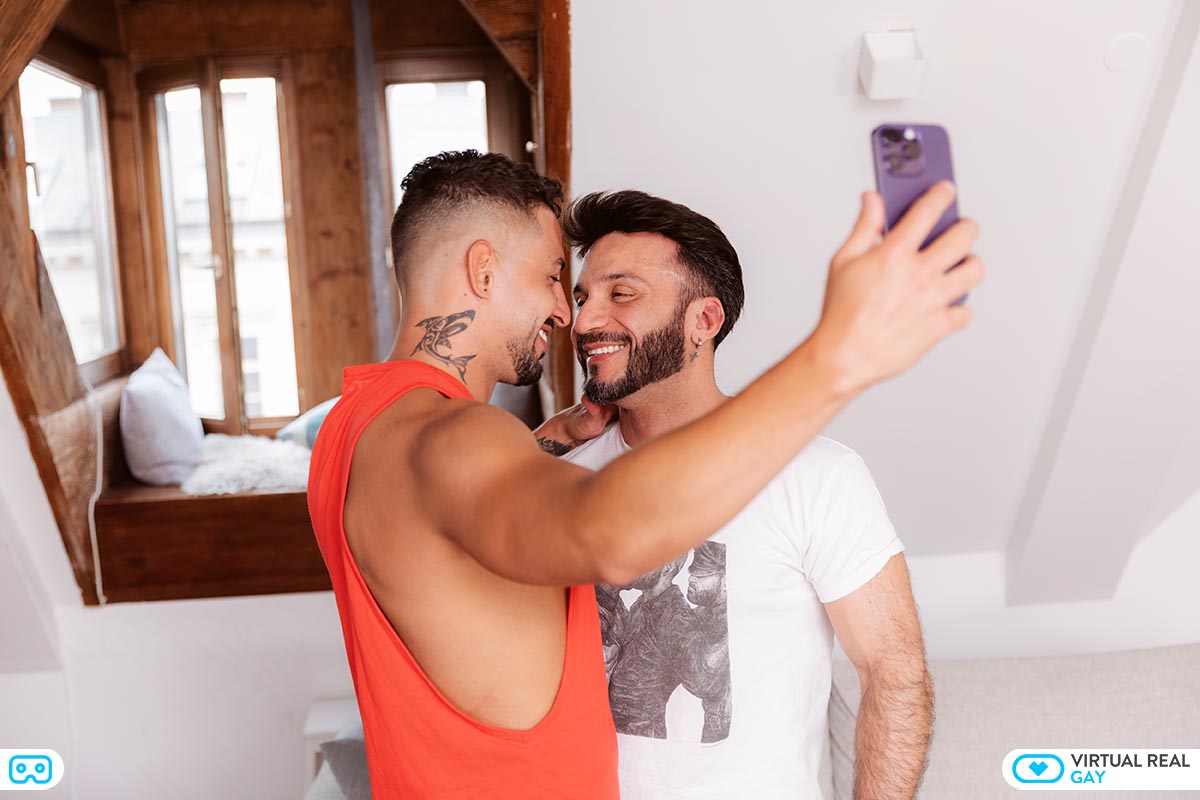 Roque Rems (POV) returns home with Kike Gil, their passionate connection evident through tender kisses and intimate touches. Capturing the moment on his phone, Roque highlights the palpable heat and desire emanating from his partner. As they undress, Kike suggests elevating the content beyond mere kisses.