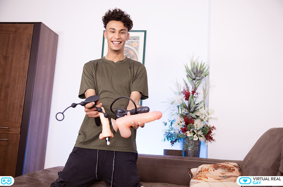 Hot young Turkish stud Kristof Plachta is playing around with some of his favorite sex toys. He is feeling horny and wants his ass filled, so is trying to decide which big dildo to insert into his tight twink ass. He thinks her will have some fun with the black dildo. But then he suddenly realizes that you are there with him in virtual reality, stroking your cock as you watch the naked young man holding various sizes of dildos. Now he can have the real thing in his ass – your stiff cock! Fuck this 18 year old lad hard in every position, as he first gives you a sloppy blowjob, then offers up his twink ass for a balls deep pounding from you!